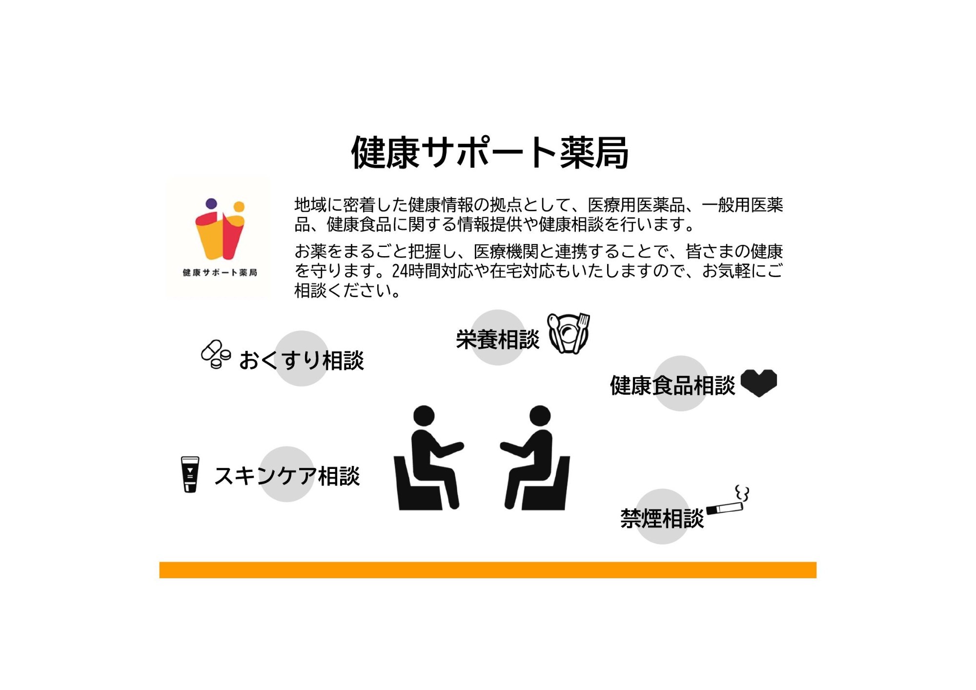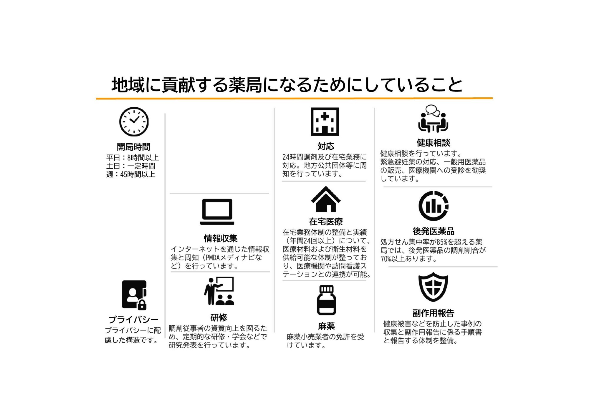 疾病に対する薬物提供のみならず、予防や健康の維持・増進といった幅広いステージにて地域貢献を行っていきます。