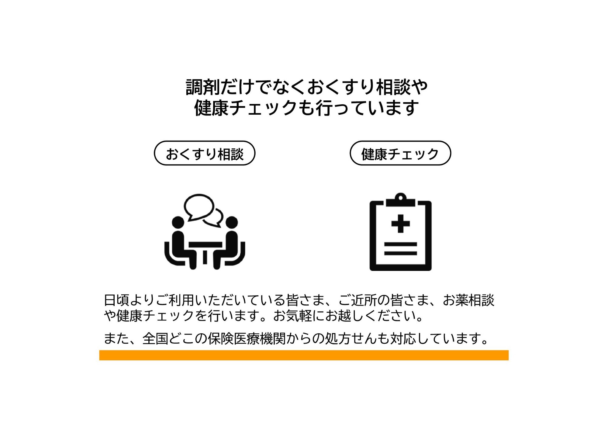 処方箋に従ったお薬をお渡しするだけでなく、お薬を正しく服用していただくためのアドバイスを行い、お薬に対する疑問や不安にお答えいたします。