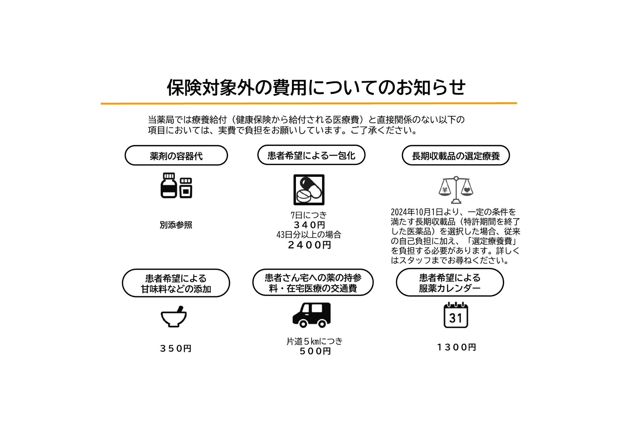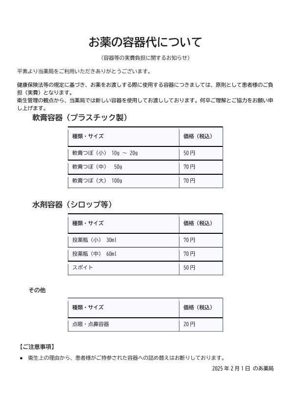 令和6年度診療報酬改定に伴い、投薬時に使用する薬剤容器代(投薬瓶・軟膏缶等)を実費徴収させていただきます。