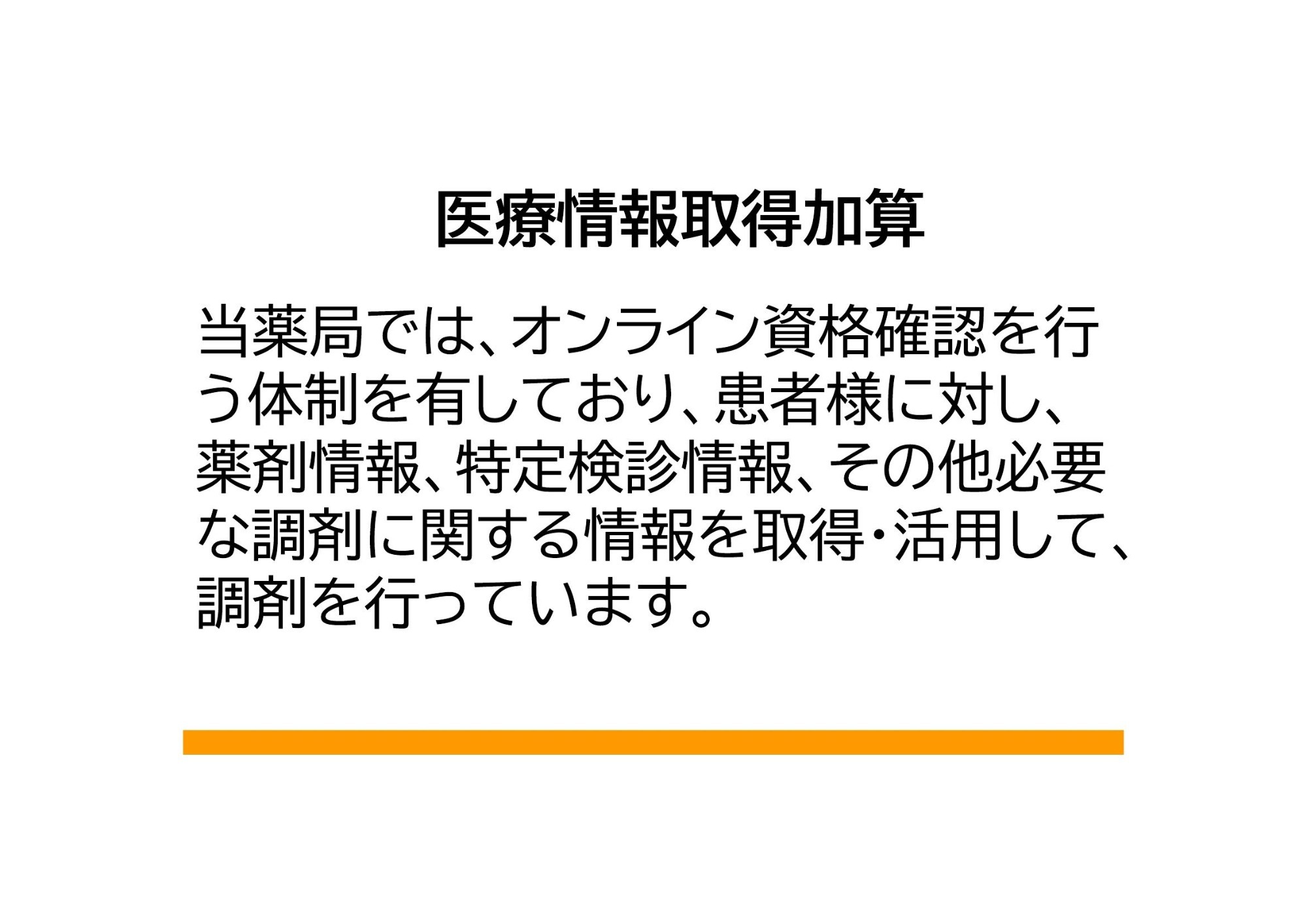 • 資格確認を行う体制を有しており、当該保険医療機関を受診した患者さんに対し、受診歴、薬剤情報、特定健診情報、その他必要な診療情報を取得活用して調剤を行っています。